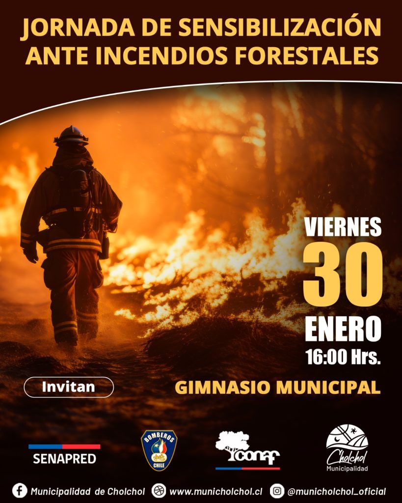 Con el objetivo de fortalecer la prevención y preparación de la comunidad frente al riesgo de incendios forestales, la Municipalidad de Cholchol a través de su unidad de Gestión del Riesgo de Desastres, GRD, encabezará una jornada de sensibilización ante Incendios Forestales, actividad que se desarrollará este viernes 30 de enero, a las 16 horas en el Gimnasio Municipal de la comuna.